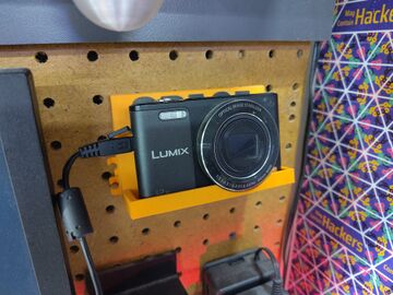 De camera hangt aan een gaatjesbord met een ge-3D-printe houder: